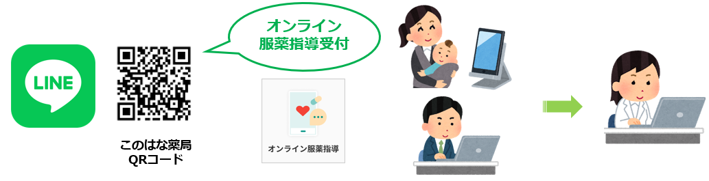 「このはな薬局QRコード」から「オンライン服薬指導」ボタンを押して、ご都合のよいお時間にオンライン服薬指導をさせて頂いた後、お薬をご自宅に郵送等いたします。